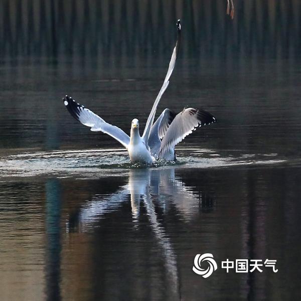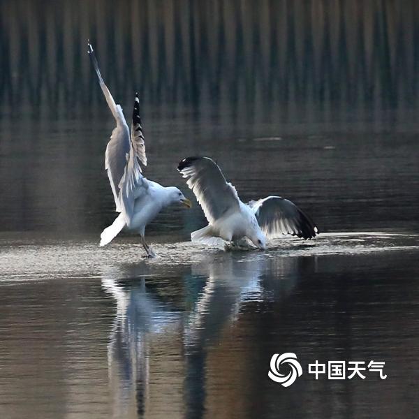 2019年02月27日 10:51近年来,天津的生态环境越来越好。今年过了雨水节气,翠屏北湖刚刚解冻,就有许多海鸥,集群飞来湖面觅食。暮色中,双鸥同时俯冲下水捉泥鳅。其中,一只高高兴兴,颇有收获;另一只竹篮打水,瞎耽误功夫了。(宛公展摄于南翠屏公园)
