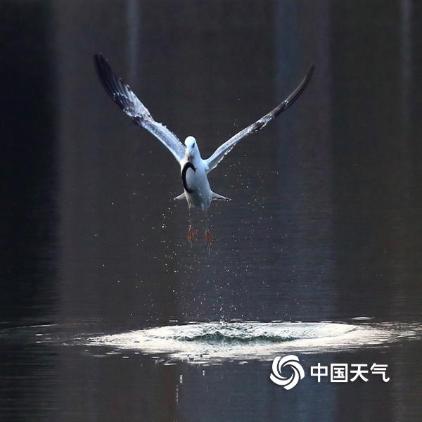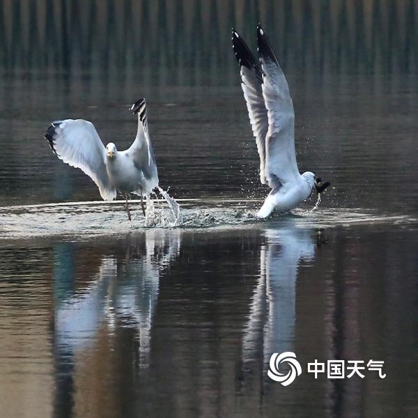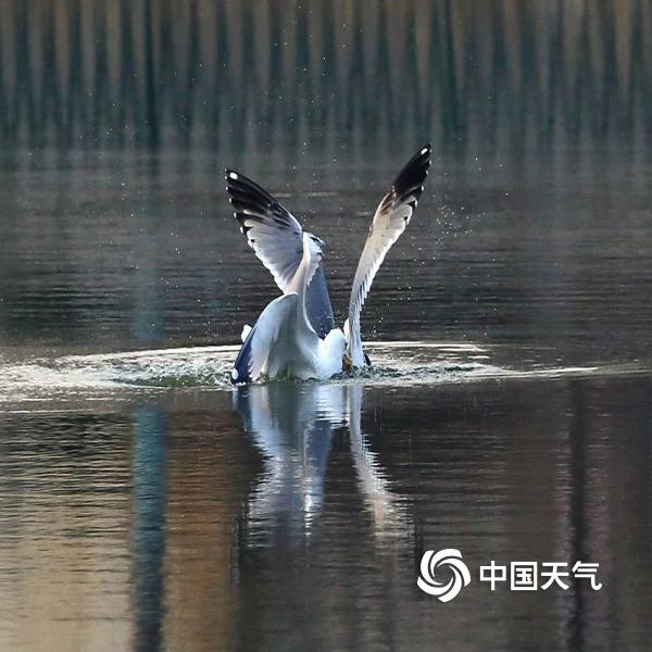 近年来,天津的生态环境越来越好。今年过了雨水节气,翠屏北湖刚刚解冻,就有许多海鸥,集群飞来湖面觅食。暮色中,双鸥同时俯冲下水捉泥鳅。其中,一只高高兴兴,颇有收获;另一只竹篮打水,瞎耽误功夫了。(宛公展摄于南翠屏公园)