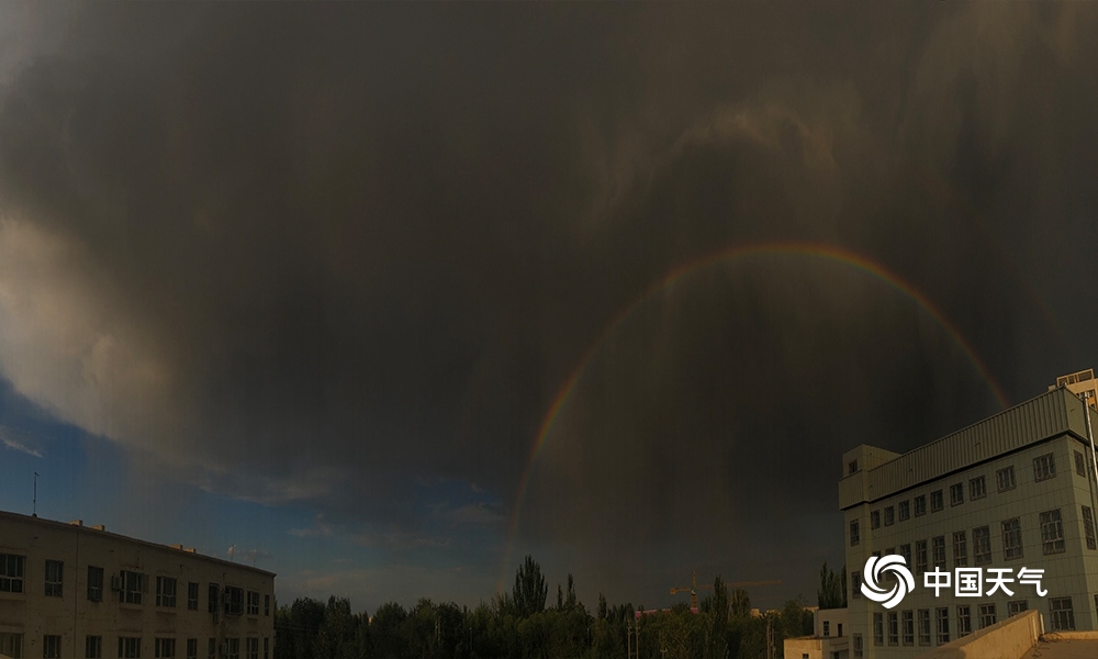 中国天气网讯 2019年12月2日,新疆巴音郭楞蒙古自治州轮台县雨后惊现彩虹,宛若彩桥悬空,景象壮观。(图文/伊尔夏提)
