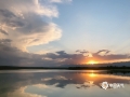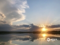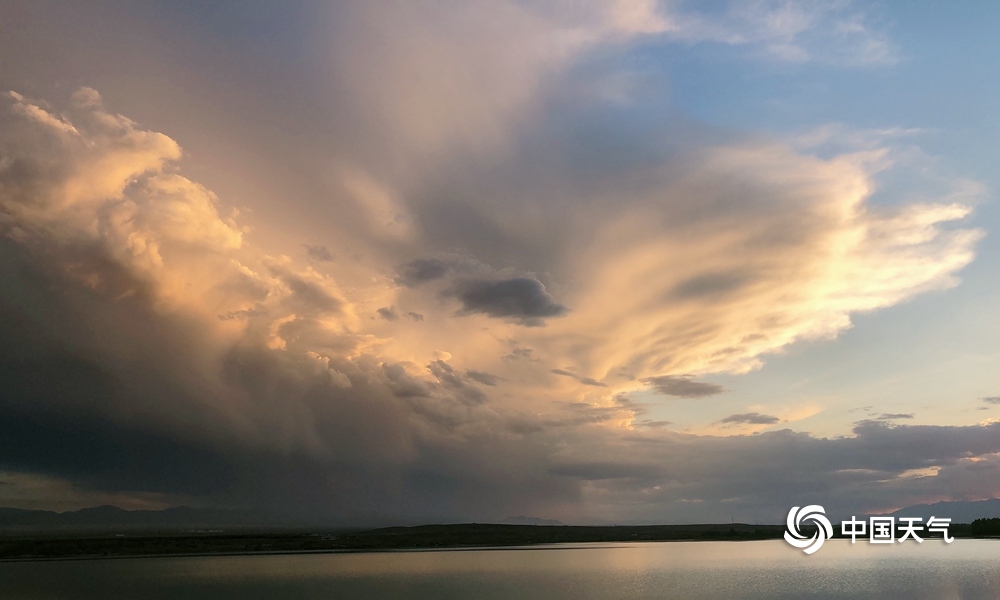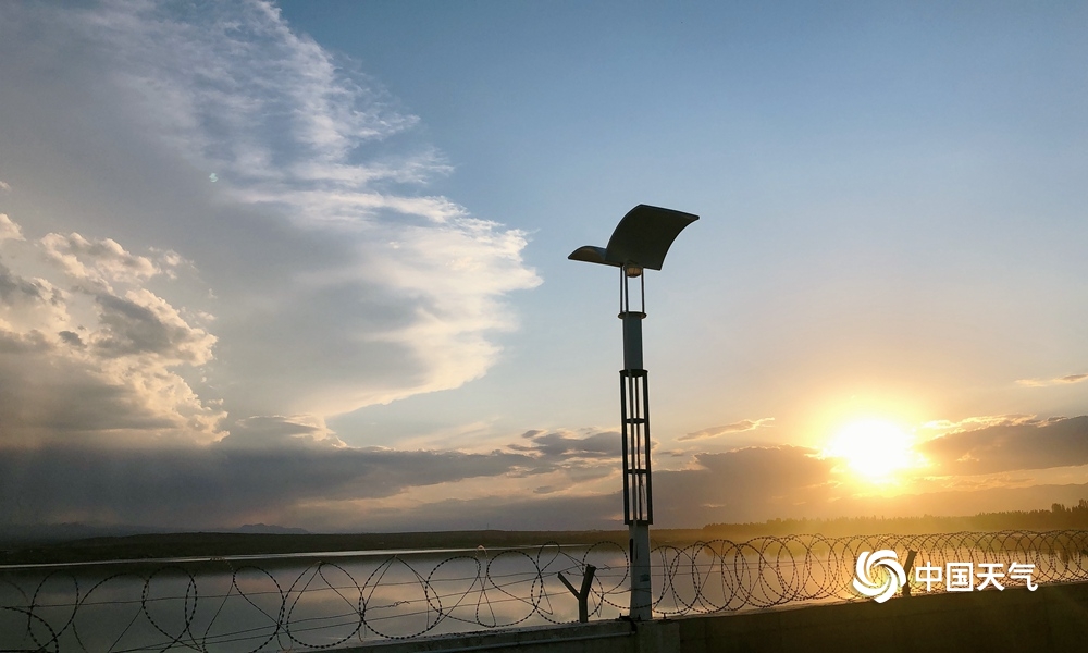 6月15日傍晚,一抹殷红色的夕阳倒影在水面上,湛蓝的天空中浮动着大块白色的云朵, 在天空中徐徐变幻出不同的形状,它们在夕阳的辉映下呈现出火焰一般的嫣红,落日即将落下地平线时,余晖洒在水面上,静谧如画,美如仙境。(图/韩佳宇 文/景继福 拍摄于博乐市五一水库)