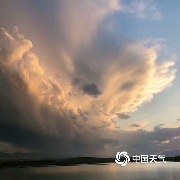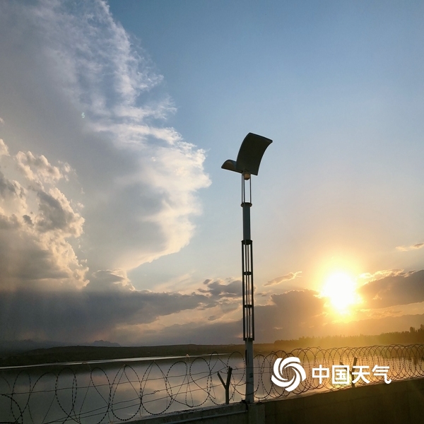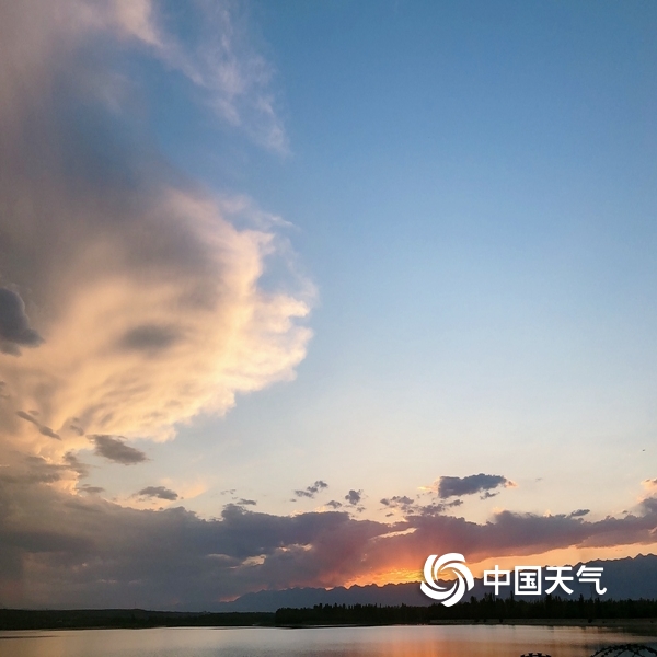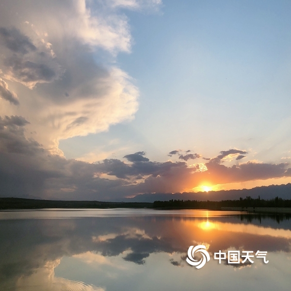 2020年06月16日 16:516月15日傍晚,博乐市五一水库,一抹殷红色的夕阳倒影在水面上,湛蓝的天空中浮动着大块白色的云朵, 在天空中徐徐变幻出不同的形状,它们在夕阳的辉映下呈现出火焰一般的嫣红,落日即将落下地平线时,余晖洒在水面上,静谧如画,美如仙境。(图/韩佳宇 文/景继福 )