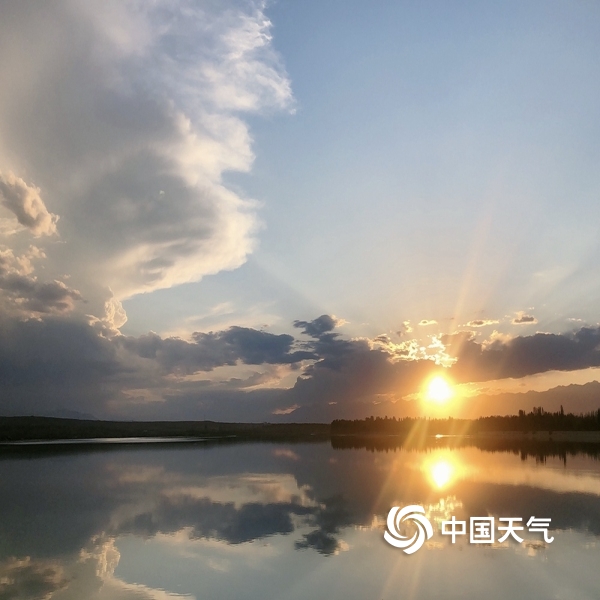 6月15日傍晚,博乐市五一水库,一抹殷红色的夕阳倒影在水面上,湛蓝的天空中浮动着大块白色的云朵, 在天空中徐徐变幻出不同的形状,它们在夕阳的辉映下呈现出火焰一般的嫣红,落日即将落下地平线时,余晖洒在水面上,静谧如画,美如仙境。(图/韩佳宇 文/景继福 )