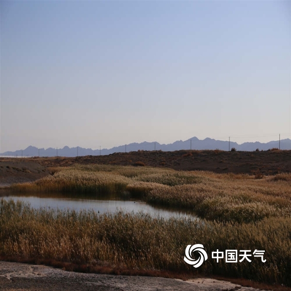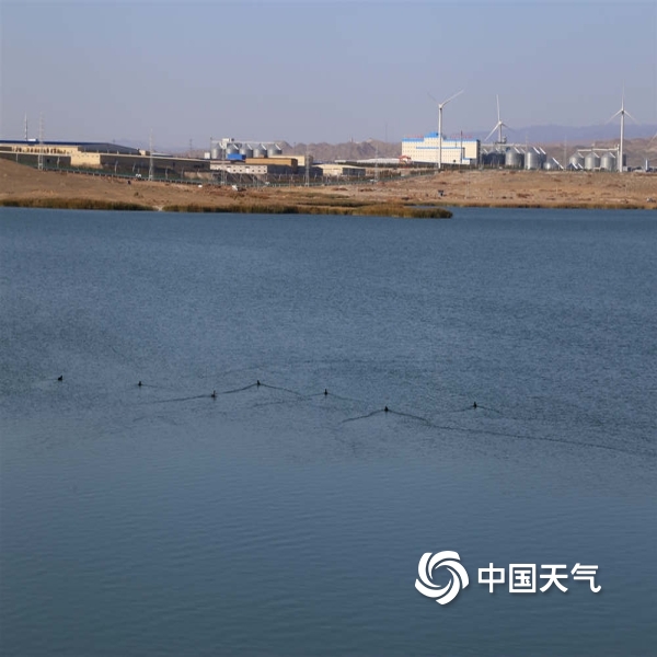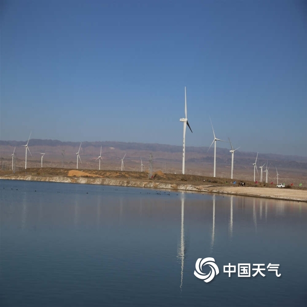 中国天气网讯 新疆阿拉山口市秋日的戈壁胡泊,水天浑然一色,野鸭划波游弋,风车点阵整齐排列,勾勒出一幅别样的深秋景象。图为阿拉山口的胡泊蓝天风车阵列