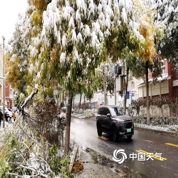 2021年10月08日 14:37图为乌鲁木齐秋季初雪压绿枝(图/李志宏)