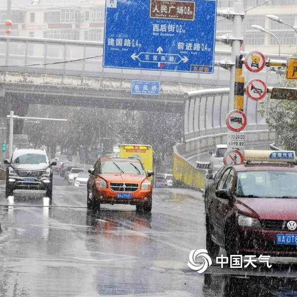 2021年10月08日 14:37图为乌鲁木齐秋季初雪中穿梭的车辆