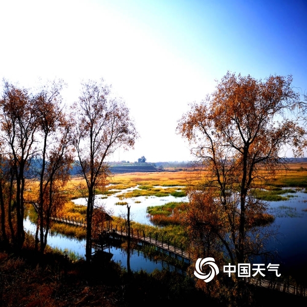 中国天气网讯 十一长假期间,新疆秋色正浓,驱车沿省道101一路向北,天高云淡,蓝天如洗,层林尽染,满目流金。 图为玛纳斯县国家湿地公园。(图/李志宏)