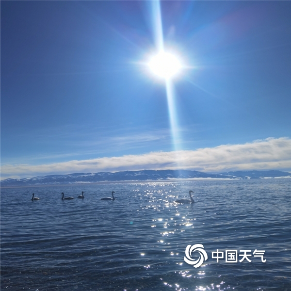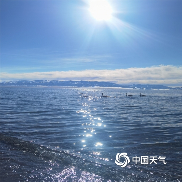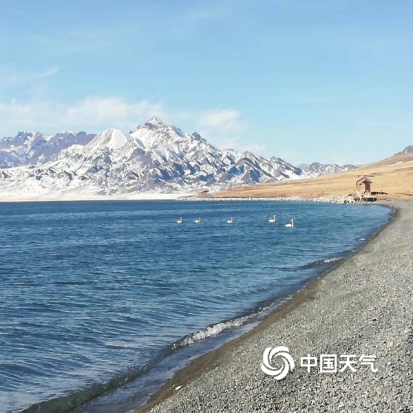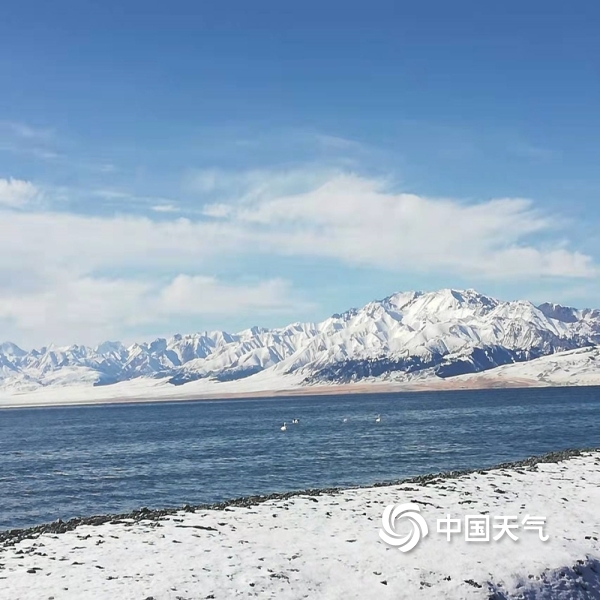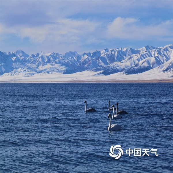 中国天气网讯 11月10日,新疆赛里木湖蓝天、白云及不远处的雪山构成了一幅美丽的画卷,午后的阳光透过白云,将细碎的光芒投射在波光粼粼的湖面,湖中洁白的天鹅在悠闲地游弋。(图/文 山亚平 吴博文)