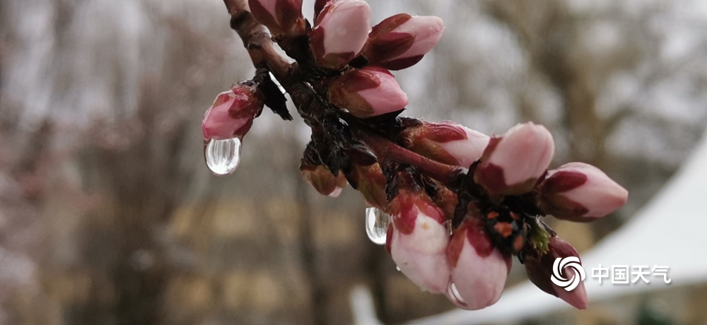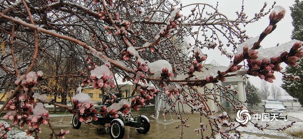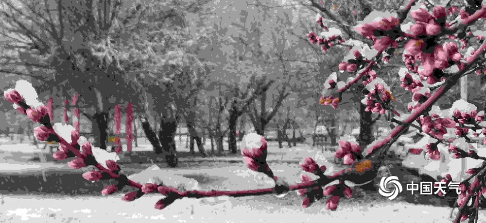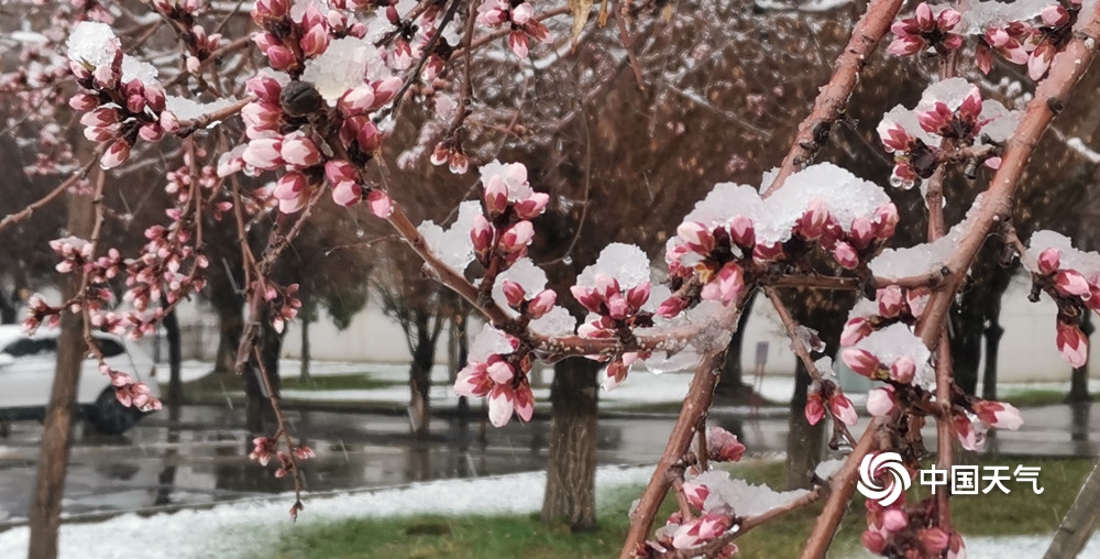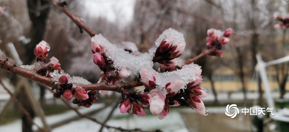 中国天气网讯 2022年​3月23日世界气象日,新疆伊犁哈萨克自治州伊宁市,天空飘起了雪,雪花落在山桃树的枝头,待放的粉红花骨朵被映衬的格外美丽。