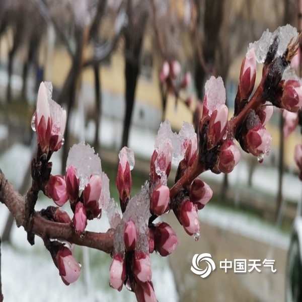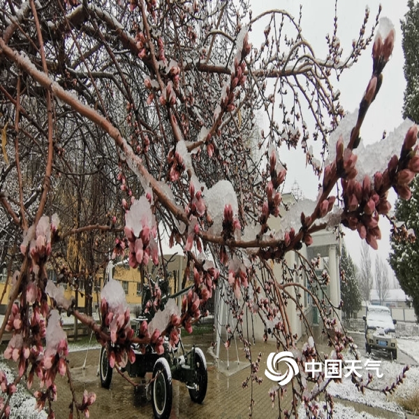 2022年03月23日 12:562022年3月23日,新疆伊犁哈萨克自治州伊宁市,天空飘起了雪,雪花落在山桃树的枝头,待放的粉红花骨朵被映衬的格外美丽。