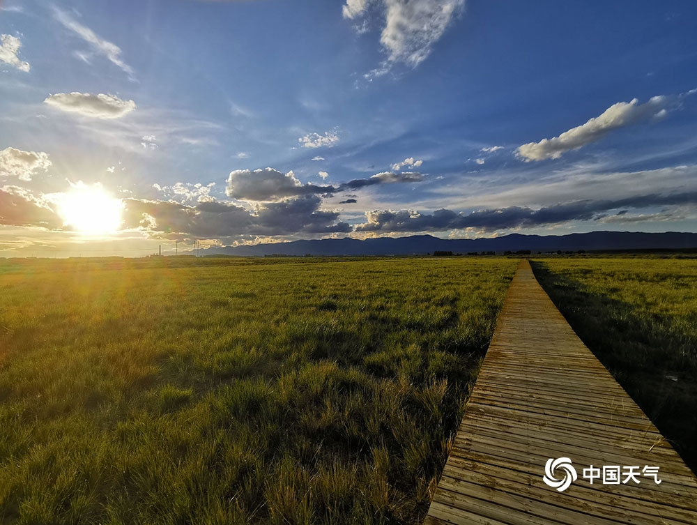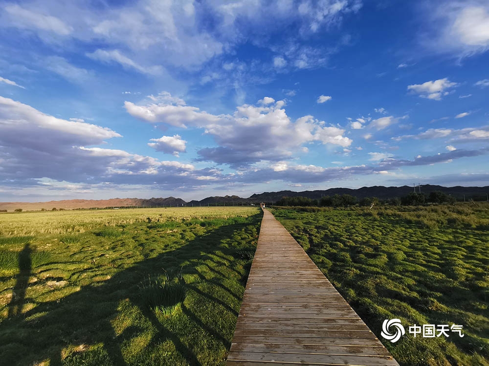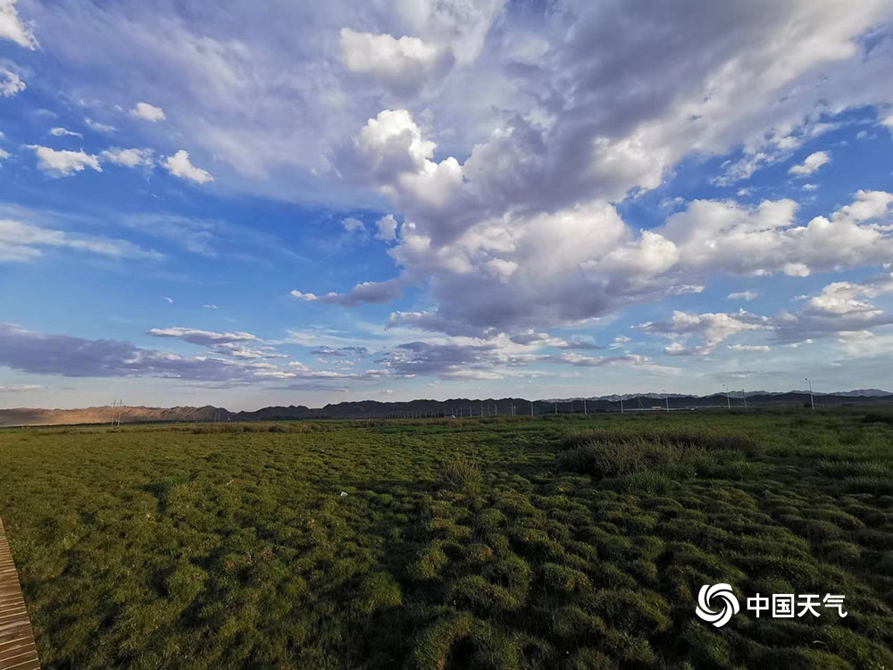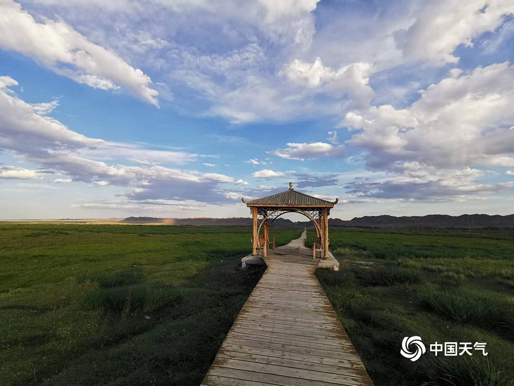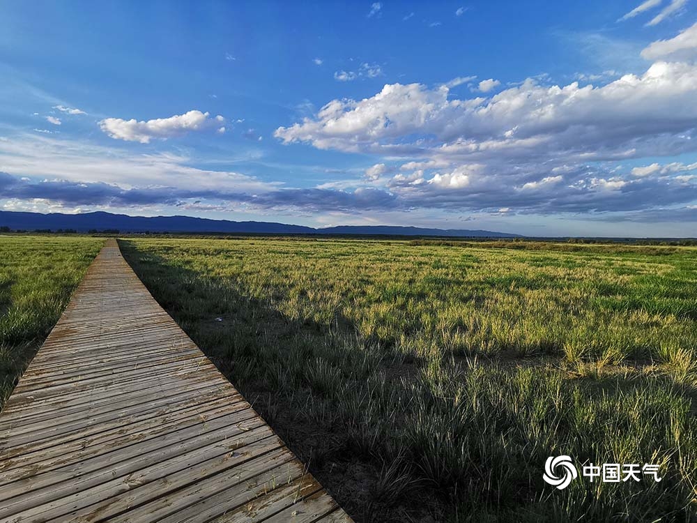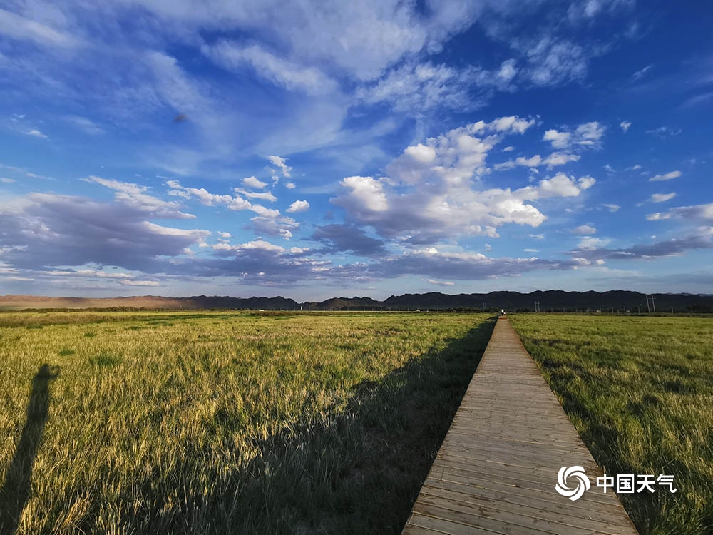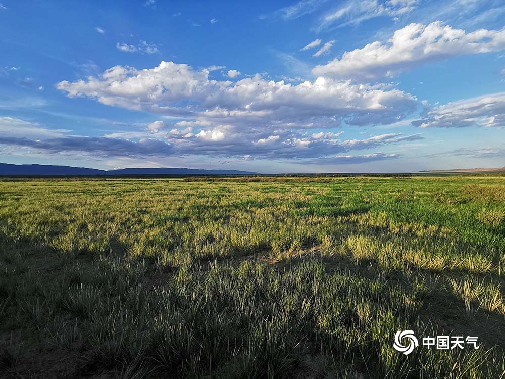 傍晚的微风,让人沉醉,蓝天白云绿草地,天然氧吧等着你。本周新一轮高温天气来袭,美丽的赛尔草原最高气温不足30℃,欢迎来避暑。 (图文:和布克赛尔县气象局 王海燕)