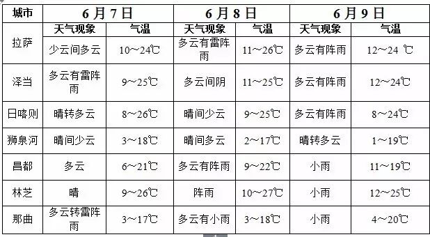 预计:高考期间,我区大部以多云天气为主,午后至夜间易出现短时雷阵雨天气,其中南部边缘地区、林芝市、昌都市和那曲东部部分地方有中雨(雪)。