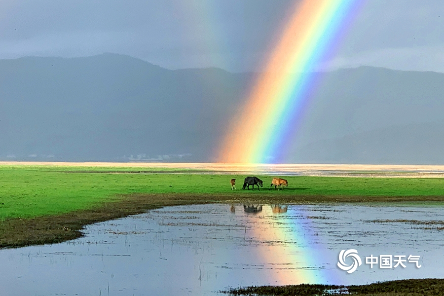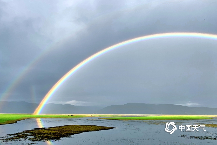 7月2日傍晚,香格里拉纳帕海上空出现精彩的“双彩虹”现象,伴着淅沥沥的小雨,景色动人,引起过往游客驻足观看。