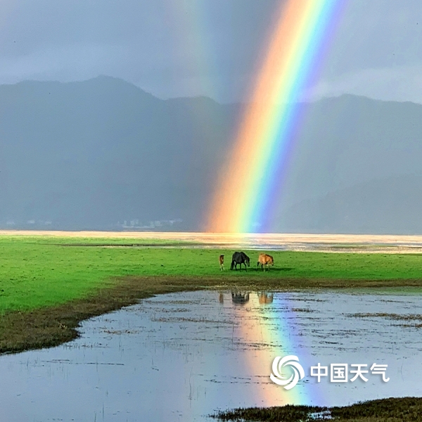 2019年07月03日 15:06中国天气网讯 7月2日傍晚,香格里拉纳帕海上空出现精彩的“双彩虹”现象,伴着淅沥沥的小雨,景色动人,引起过往游客驻足观看。图为在彩虹下悠然吃草的骏马。摄/李安琪 文/孙娅蕾