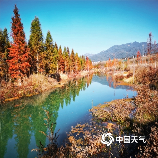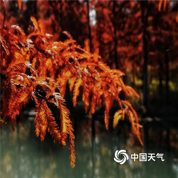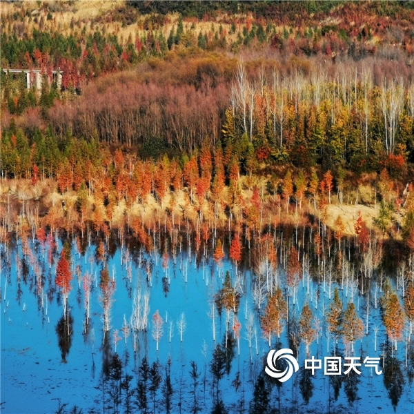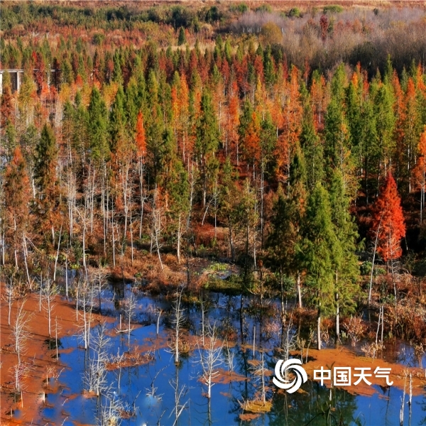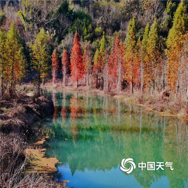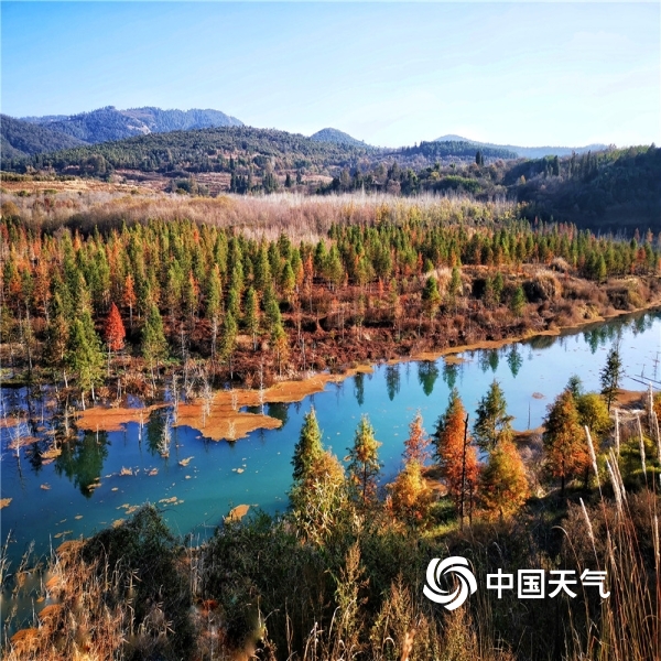 中国天气网讯 甸尾村水杉湿地位于昆明市滇池上游,处于松华坝水源保护区内。入冬以后(17日),这里的水杉叶色由绿渐变成金黄或者红色,然后逐渐掉落。树与水交相辉映,水杉因湖水的润泽而亭亭玉立,湖水因水杉的林立平添几分旖旎风情。波光树影宛如一幅幅绚烂的油画,令人流连忘返。(文图/郭荣芬)