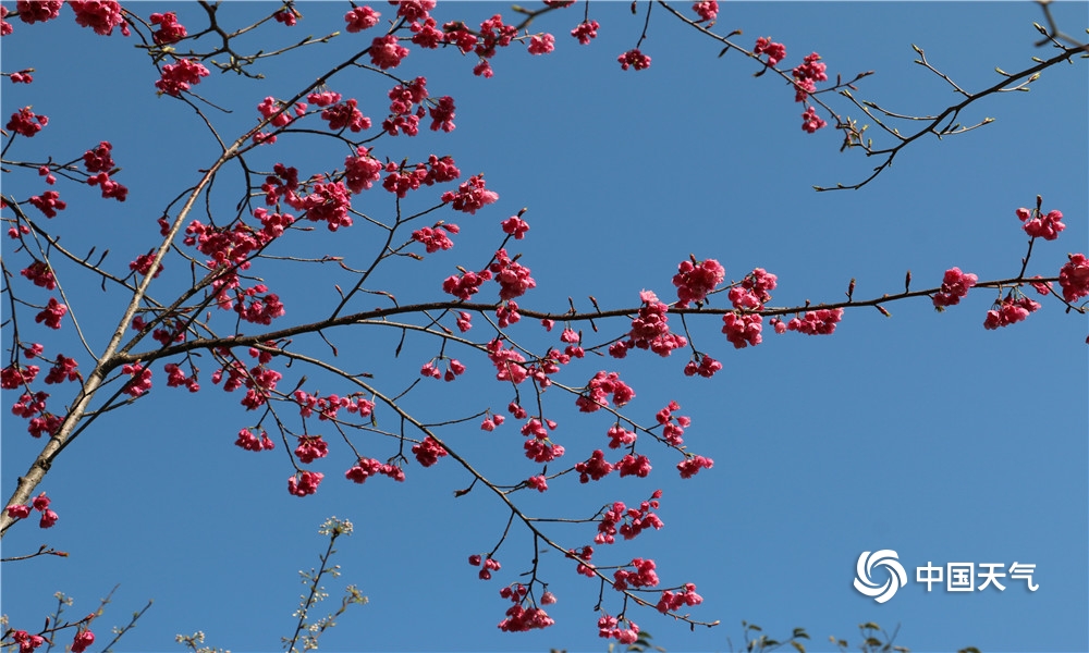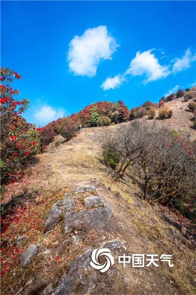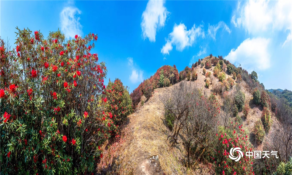 站在高山之巅极目远眺,天高云淡,远山含黛,陇川坝子和盈江坝子一览无余;当满山遍野、烂漫怒放的红色杜鹃花树映入眼帘时,它们的殷红浓烈,惊艳了眼,震颤了心。