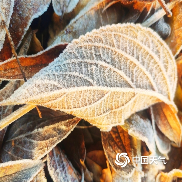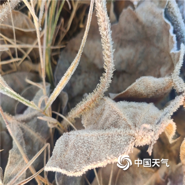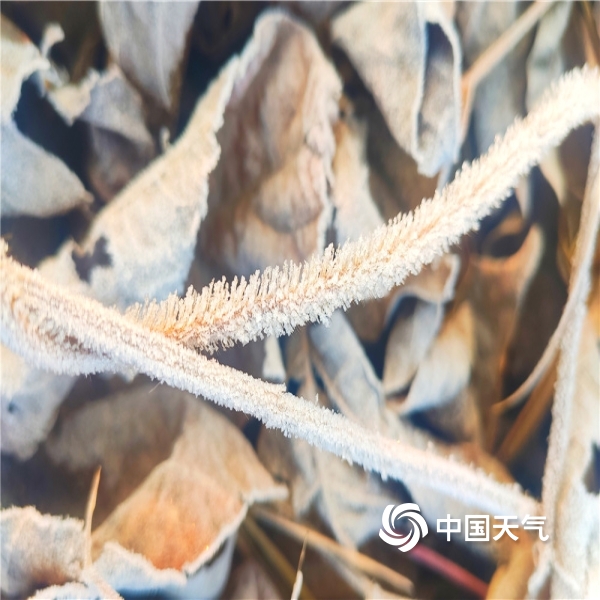 中国天气网讯 云南多地在刚刚经历了一场寒潮影响后,早晚气温仍旧低迷,今天清晨,云南省曲靖市富源县境内草面、农作物上出现浓霜,霜花以独特的方式镶嵌在植物上,别具韵味。文/图 余芳艳