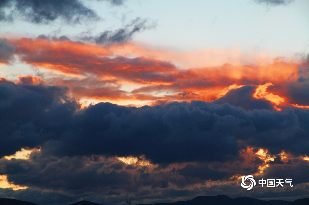 5月2日傍晚,香格里拉云霞尽染山峦,橙黄色的光柱透过云层慢慢散开,形成了一幅五彩斑斓的醉人景象。
