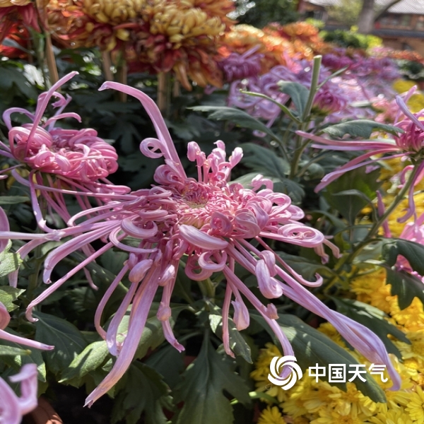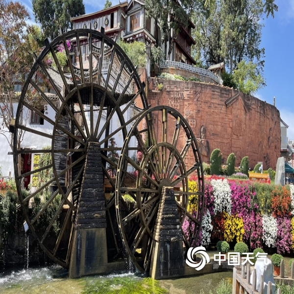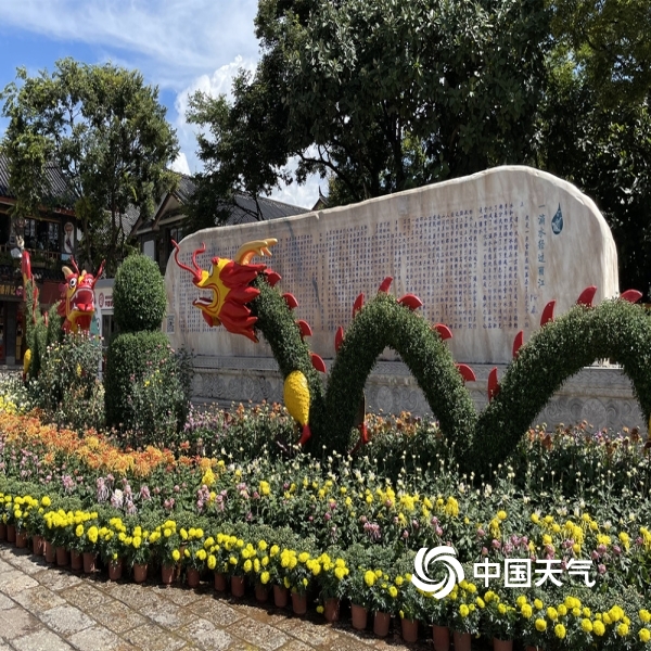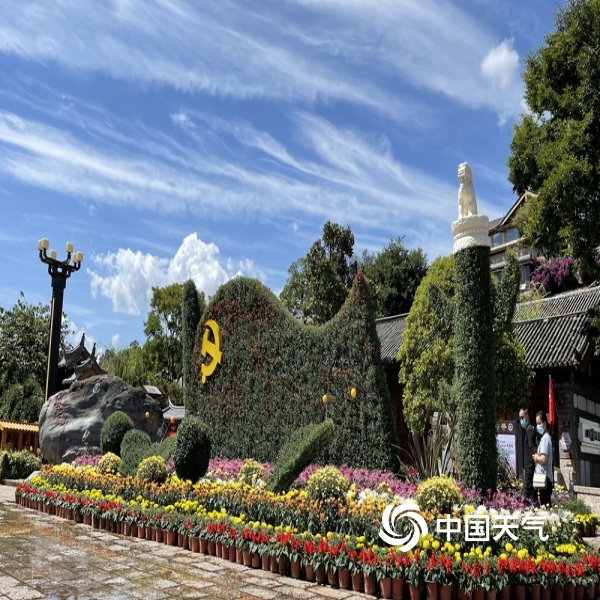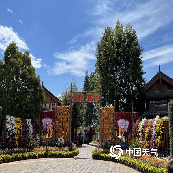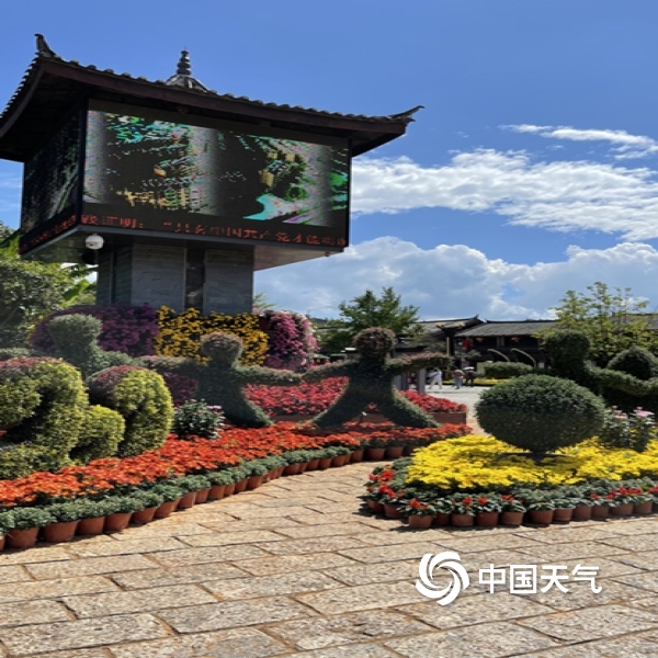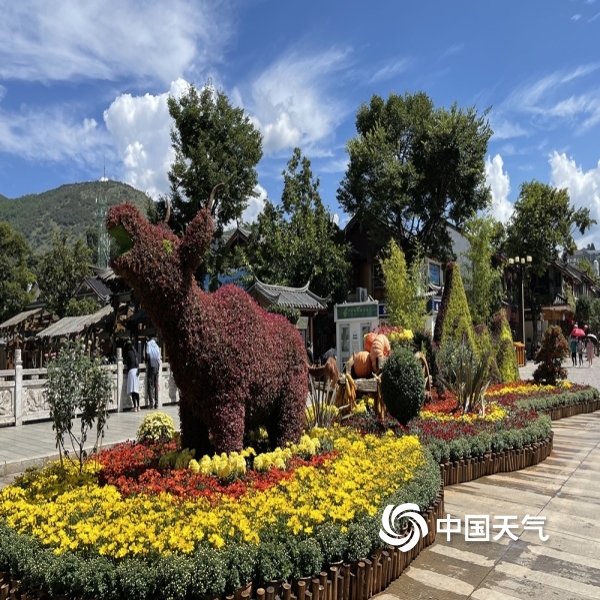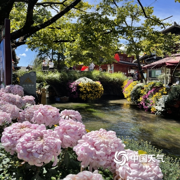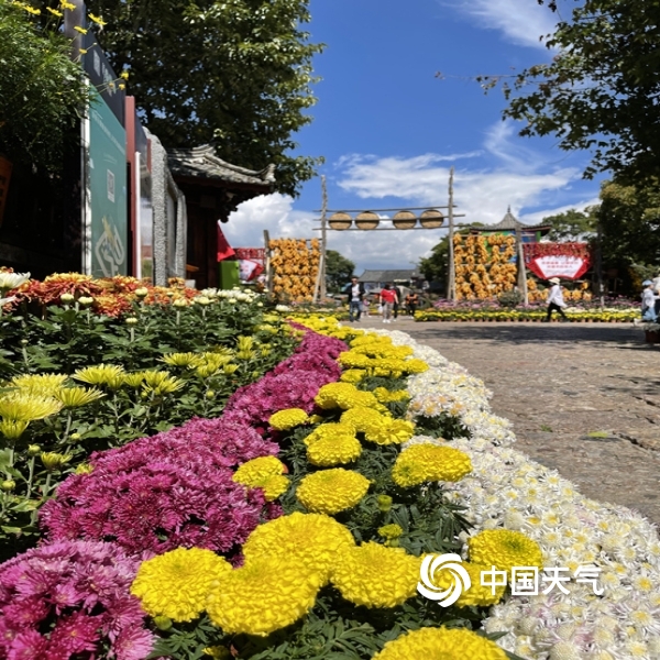中国天气网讯“不是花中偏爱菊,此花开尽更无花”。进入秋季,丽江雨水渐少,气温转凉。蓝天白云下大研古城3万余盆菊花竞相开放,花潮似锦,姹紫嫣红,喜迎国庆假日八方游客来欣赏。(图文/赖云华)