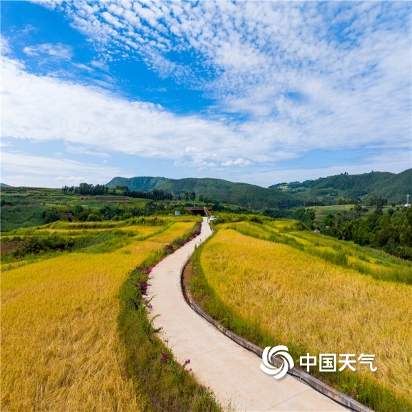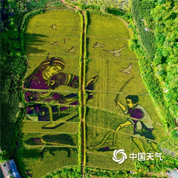 当前已进入秋季稻谷收割期,在蓝天白云映衬下,稻穗黄、青山绿及彩色主题稻田画共同构成一幅天然美丽的乡村图景。图为摄9月20日摄于云南省宜良县。(图/陈秋芳;文/王永明)